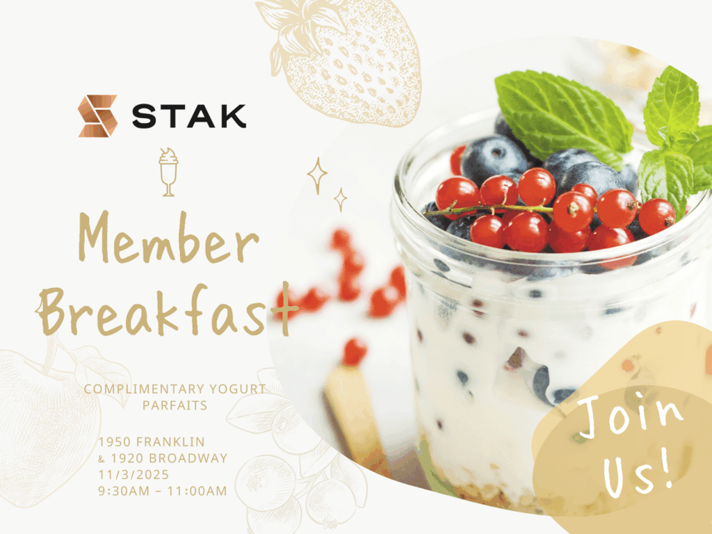 Join STAK Members for complimentary yogurt parfaits at our 1920 Broadway (2nd Floor) and 1950 Franklin (18th Floor) locations!
